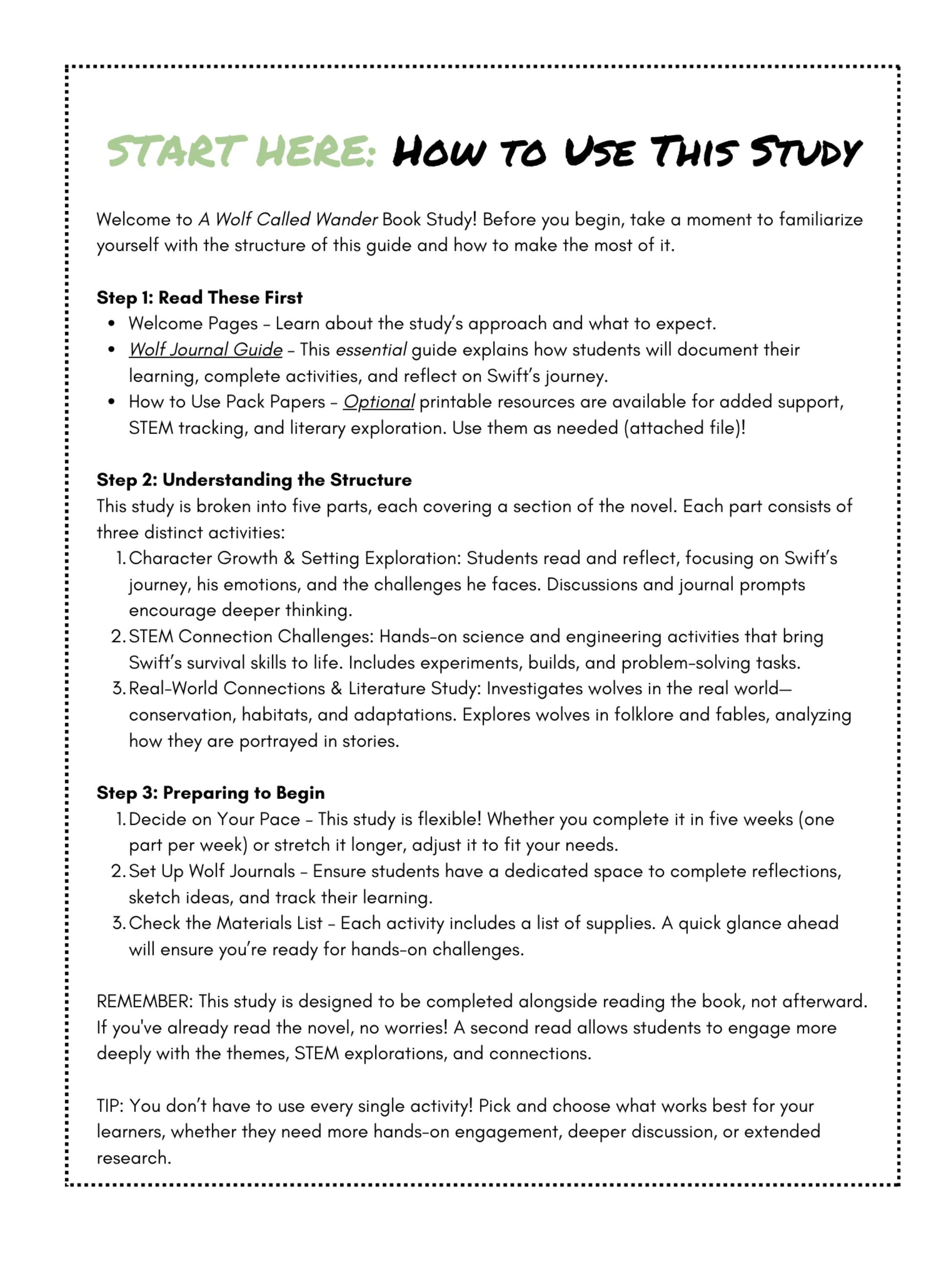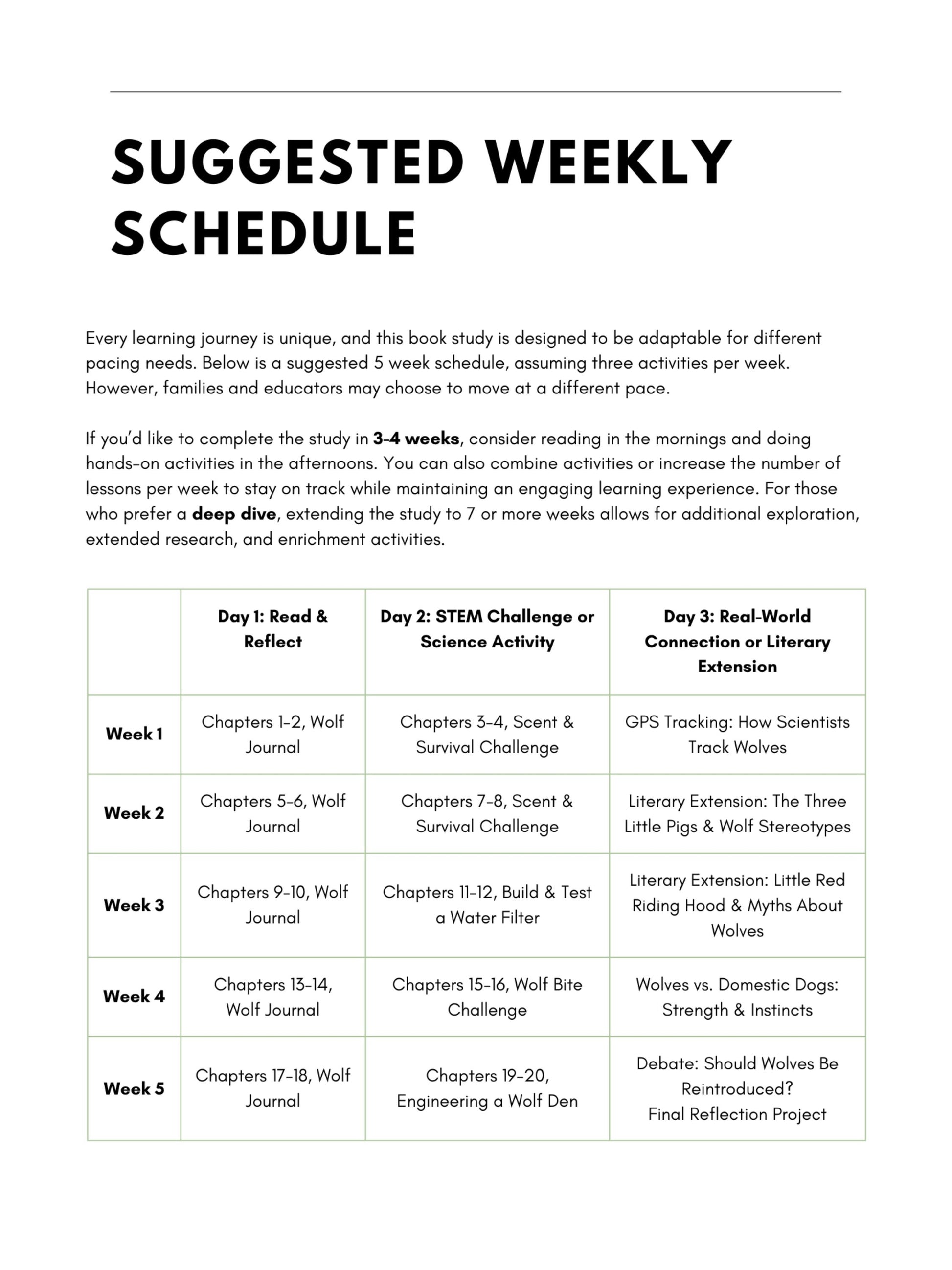 This immersive study brings Rosanne Parry’s A Wolf Called Wander to life through science, storytelling, and exploration. Designed for grades 3–6 (with flexible extensions for grades 7–8), students will follow Swift’s transformation from lost pup to confident pack leader—while diving into science experiments, character studies, and real-world wolf behavior.
