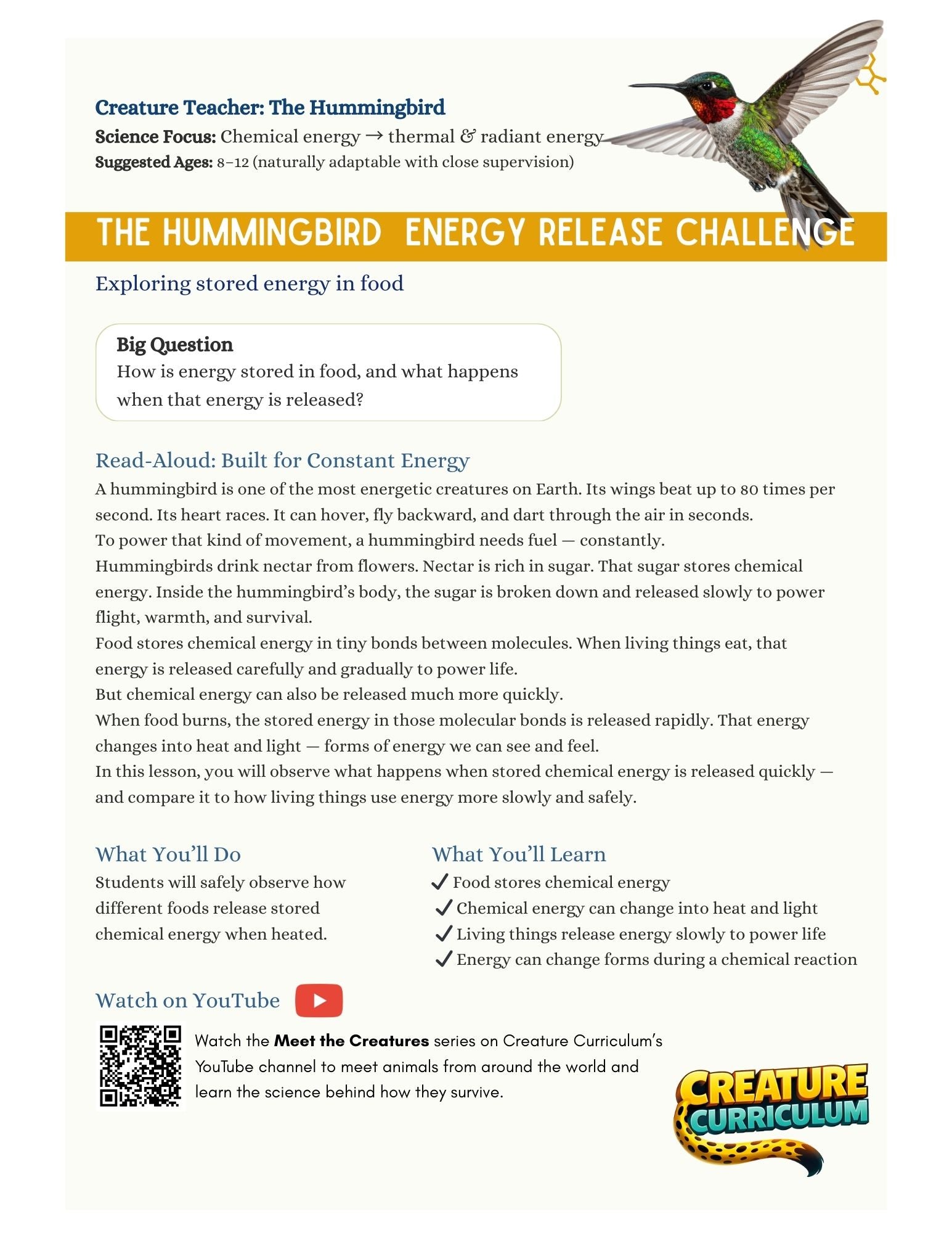 Students observe chemical energy stored in food by safely burning small samples and comparing heat, light, and burn time. Inspired by how hummingbirds rely on sugar-rich nectar to power constant flight, this investigation explores how stored chemical energy is released and transformed.