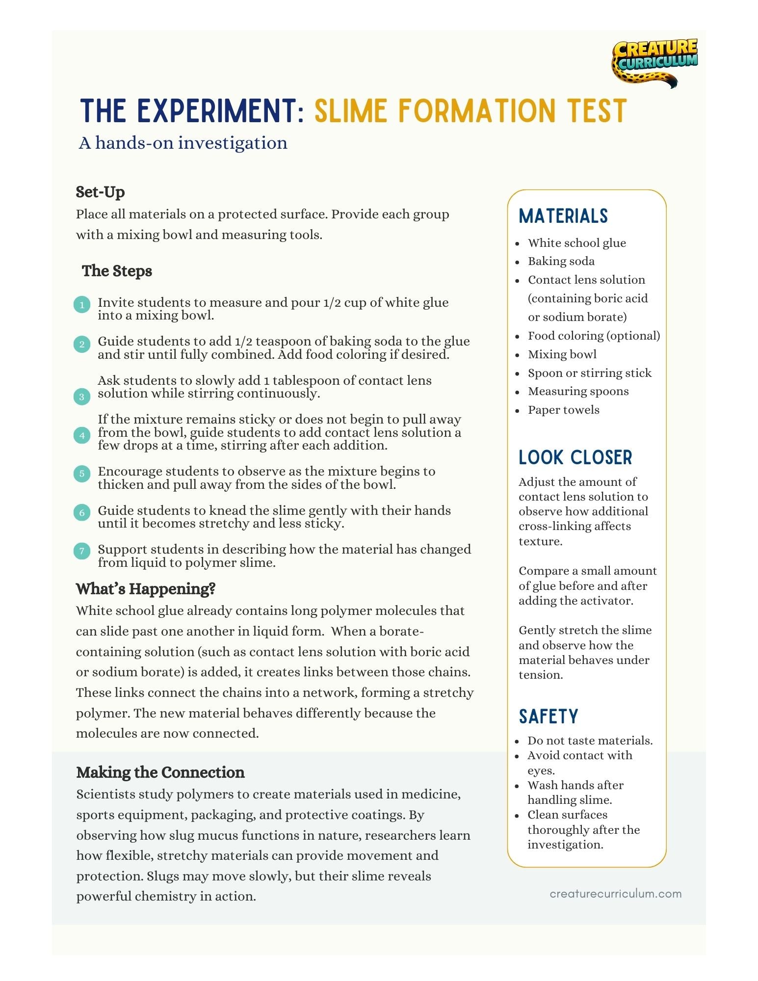 Students investigate polymers by creating slime and observing how small molecules link together to form a stretchy new material. Inspired by the thick mucus slugs use for movement and protection, this hands-on experiment explores how chemical reactions can transform liquids into flexible, elastic polymers.