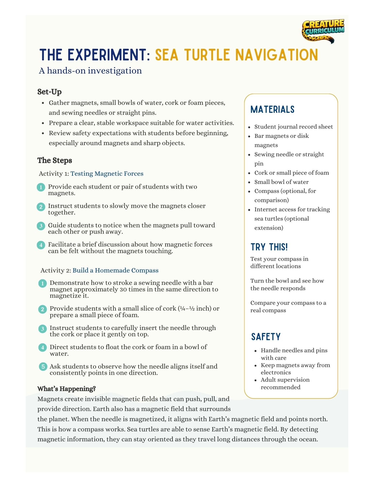 In this hands-on science lesson, students explore magnetism and Earth’s magnetic field to understand how sea turtles navigate vast distances. Using simple materials, learners investigate magnetic forces, build a basic compass, and observe how magnets naturally align — revealing how animals can sense invisible forces in the natural world.