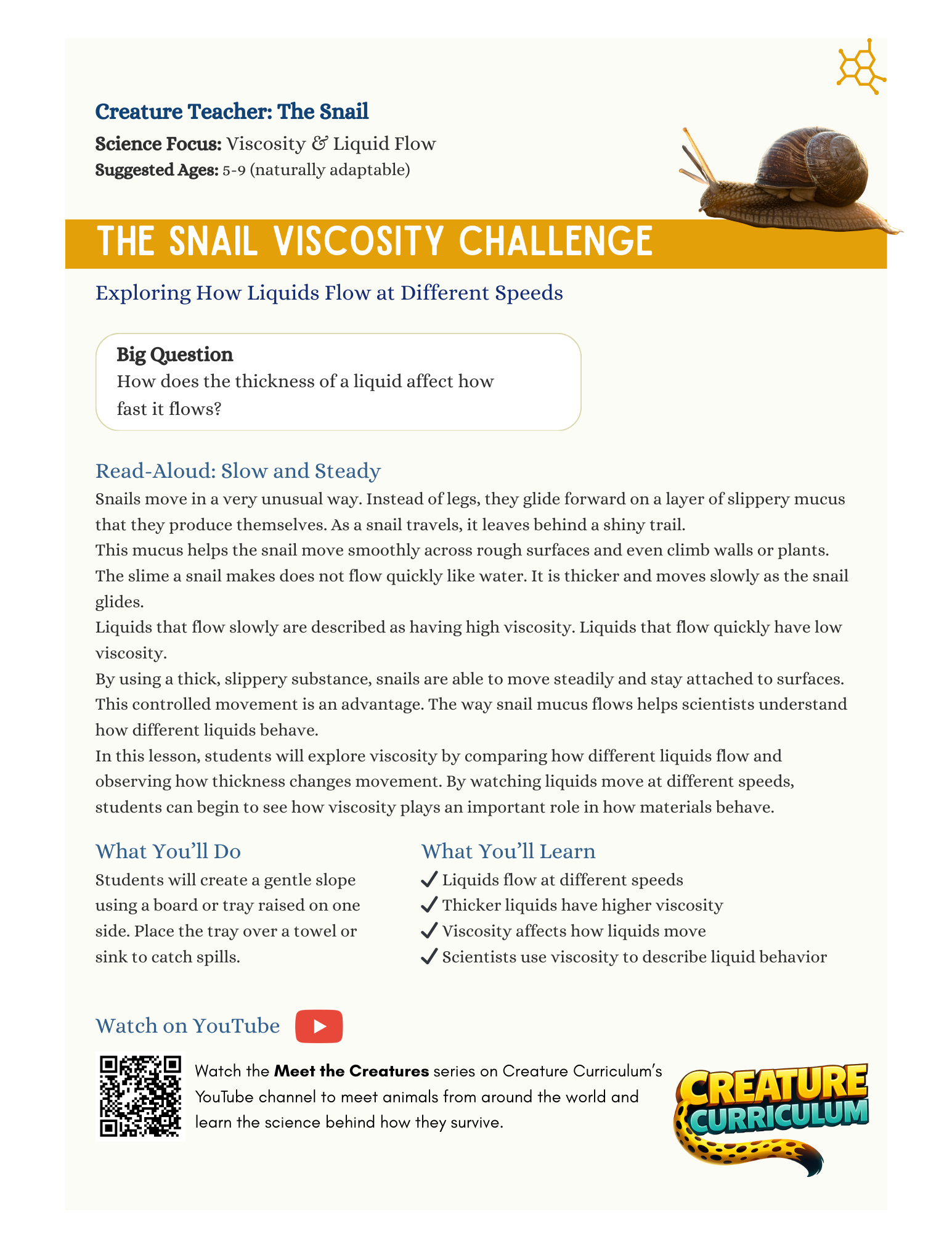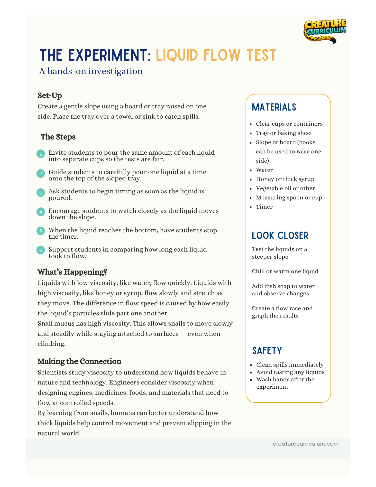 Students investigate viscosity by comparing how different liquids flow and resist movement. Inspired by the smooth, steady trails snails leave behind as they glide, this hands-on experiment explores how liquid thickness affects speed, motion, and control.